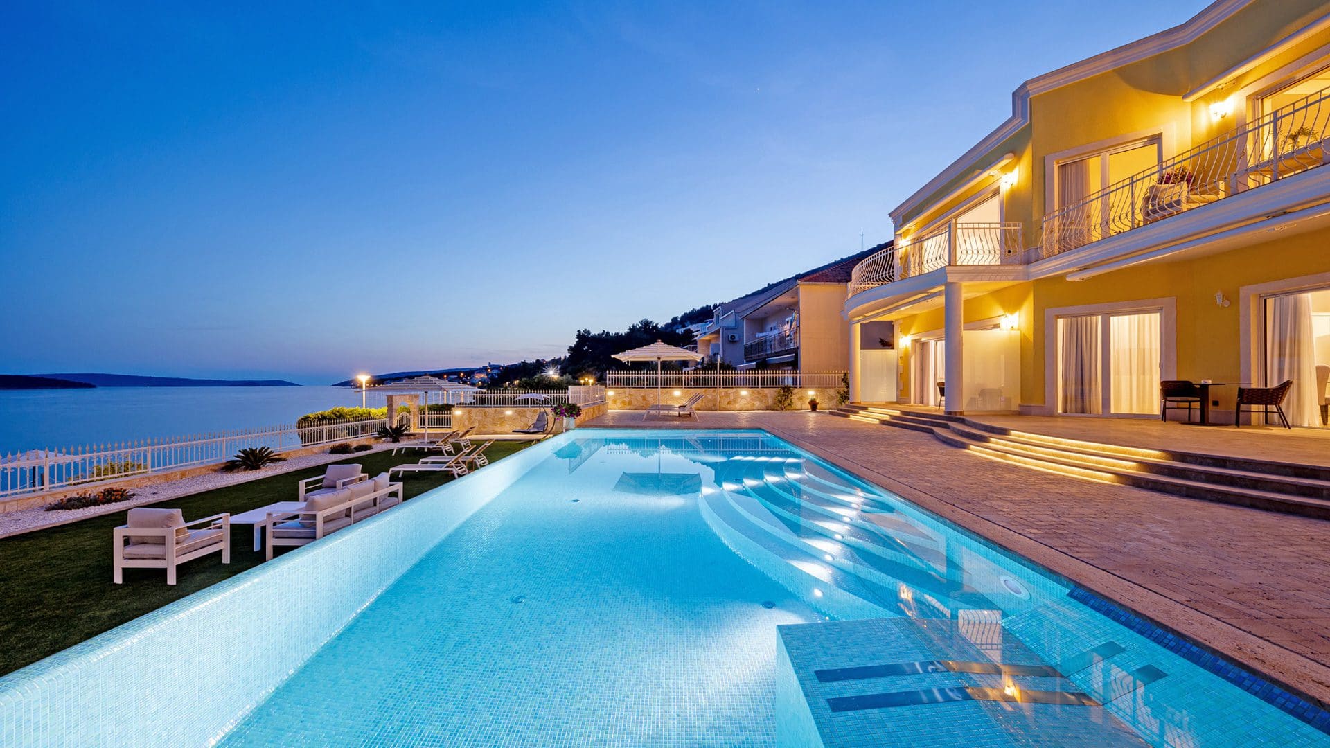 Schwimmen Sie im Außenpool oder entspannen Sie sich im Garten mit wundervollem Meerblick.